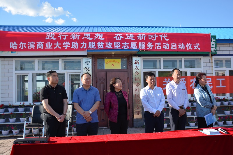 六月的北国,日晴风暖。我校驻村扶贫工作队驻地——齐齐哈尔市依安县新发乡福来村沉浸在欢乐的海洋里。6月4日下午,“践行新思想•奋进新时代”哈尔滨商业大学助力脱贫攻坚职工志愿服务启动仪式在福来村群众广场举行。