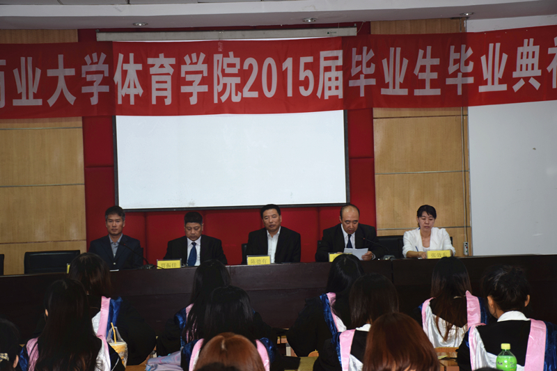 体育学院院长韩国纲教授对经过四年不懈努力而顺利毕业的2015届毕业生表示了由衷的祝贺,同时提出了三点希望,第一要求同学们继续发扬优良的校风,院风,以国家发展民族振兴为己任;第二要不畏艰难,努力学习,踏实工作;第三要秉承校训,爱岗敬业,以优异的成绩来证明和实现自身的价值。