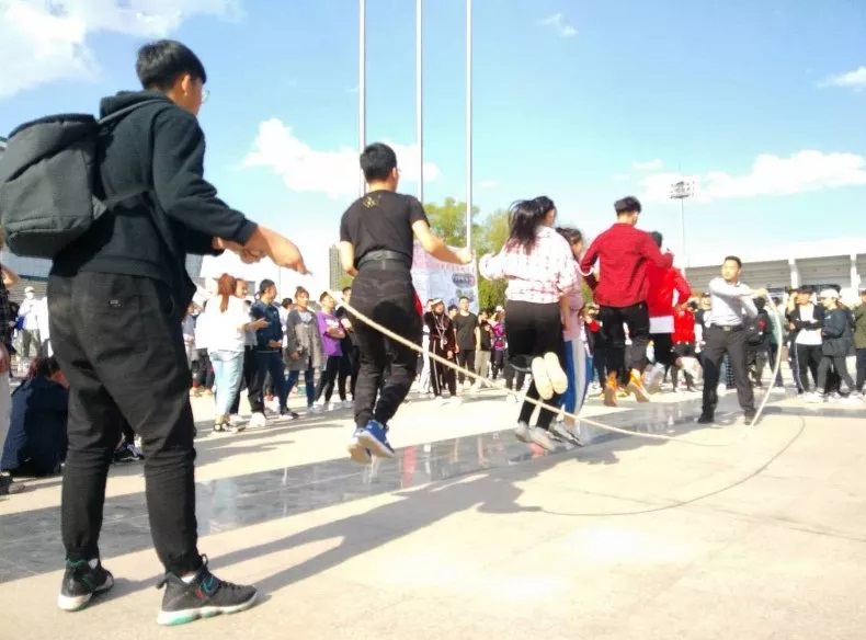 学生集体跳长绳是一项考验参赛人员集体合作与身体协调的一项运动,随着绳子每一次敲打地面每个人奋力跳起的样子定格在每个人员的心。