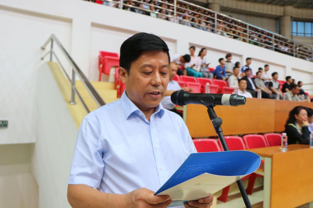 校党委书记孙先民致欢迎词。他首先代表我校全体师生对所有来宾、运动员、裁判员、教练员表示欢迎和感谢。他表示,我校多年来高度重视体育事业的发展,坚持国际视野,拓展国际交流,先后成功举办首届“一带一路”国家高校“冰雪体育经济论坛”,“亚洲大学体育交流项目”,2016美式橄榄球青年组世锦赛和2018世界大学生美式橄榄球锦标赛等国际性体育赛事与学术交流活动。